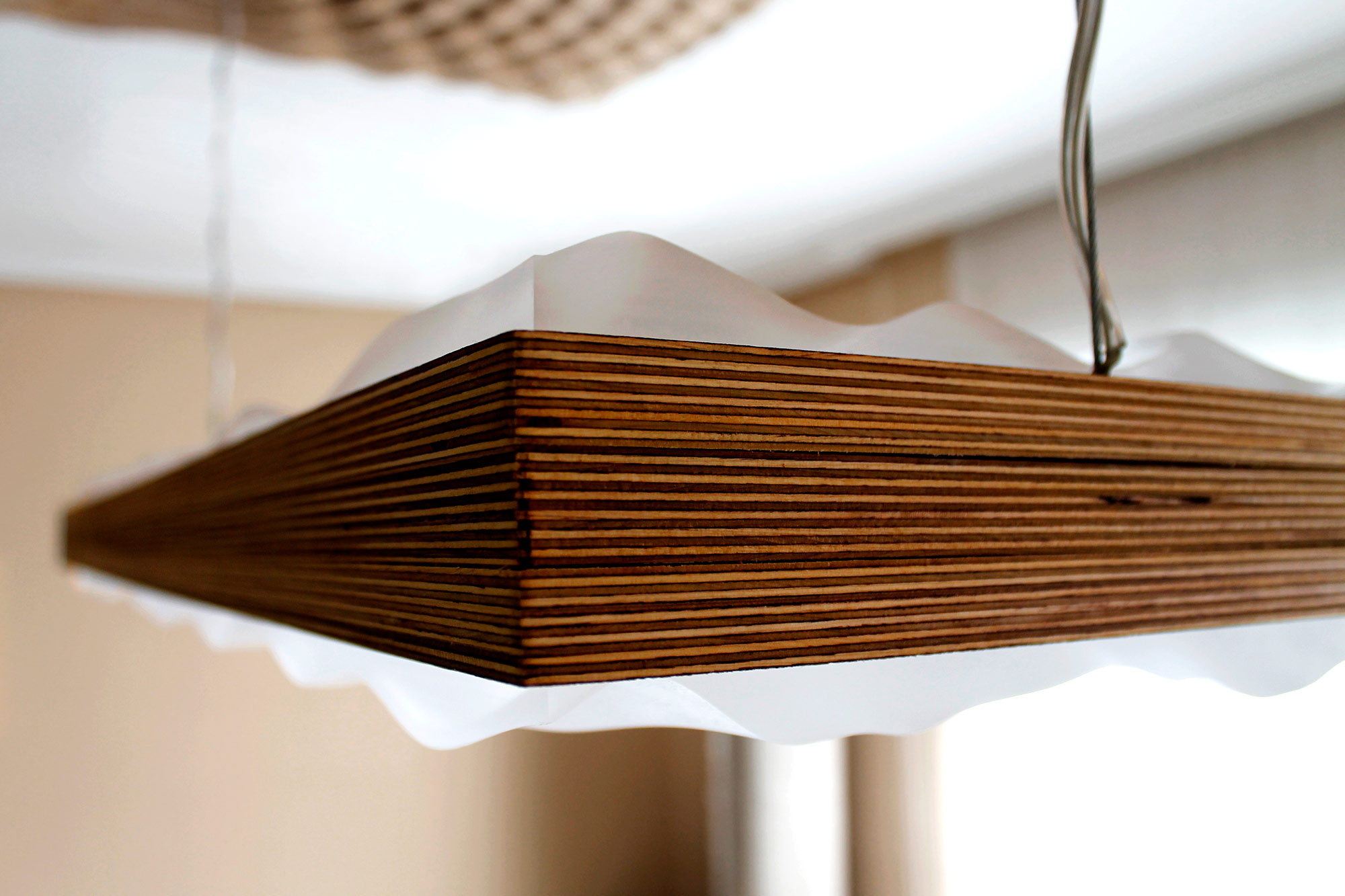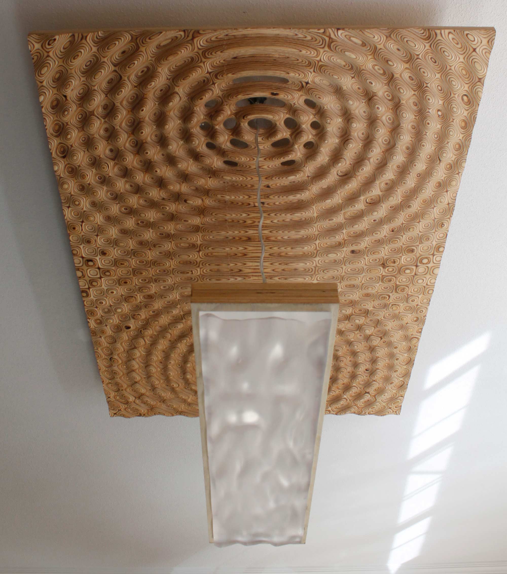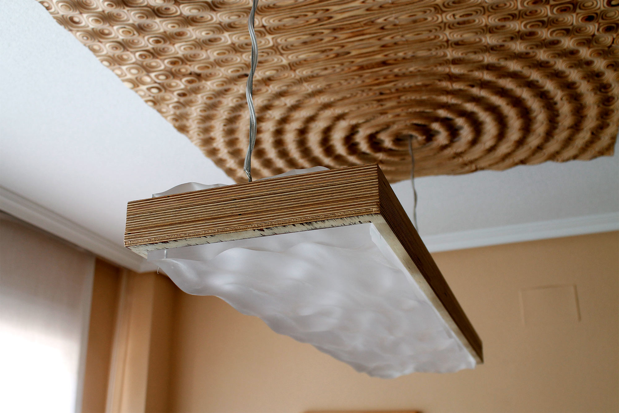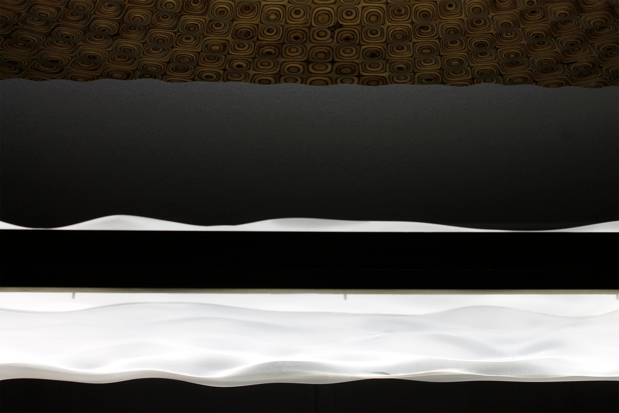 Asimismo en el plano inferior nos encontramos con una lámpara compuesta por dos elementos tridimensionales construidos a partir del fresado de metacrilato de 30 mm. En ellos se refleja el efecto que se produce en una superficie donde los focos que generan dichas ondas son múltiples. Un movimiento caótico en apariencia, que enfatiza la sensación natural de la luz.