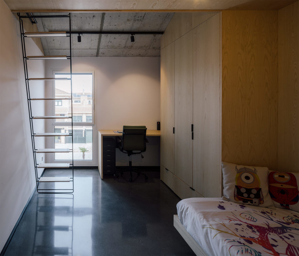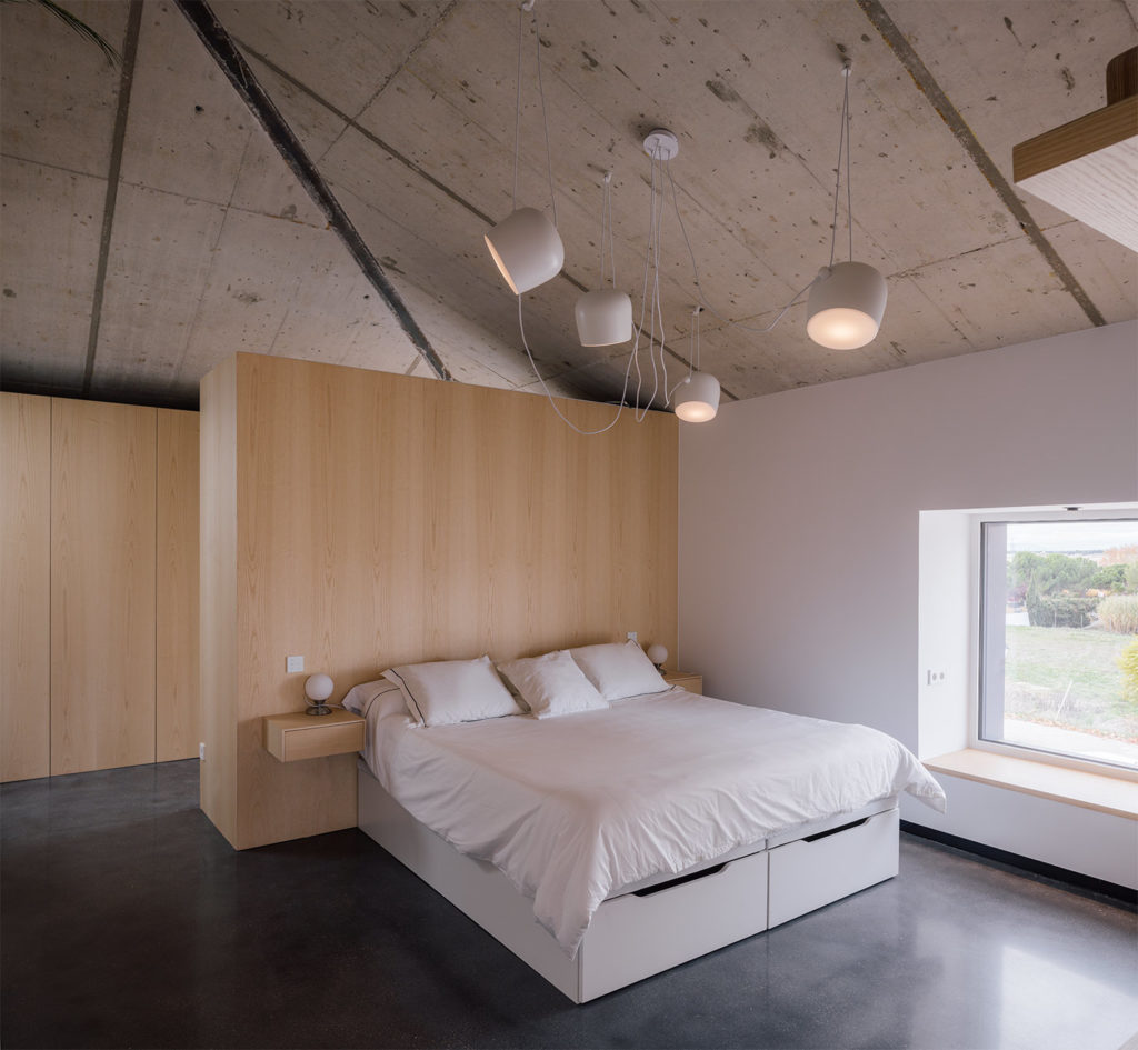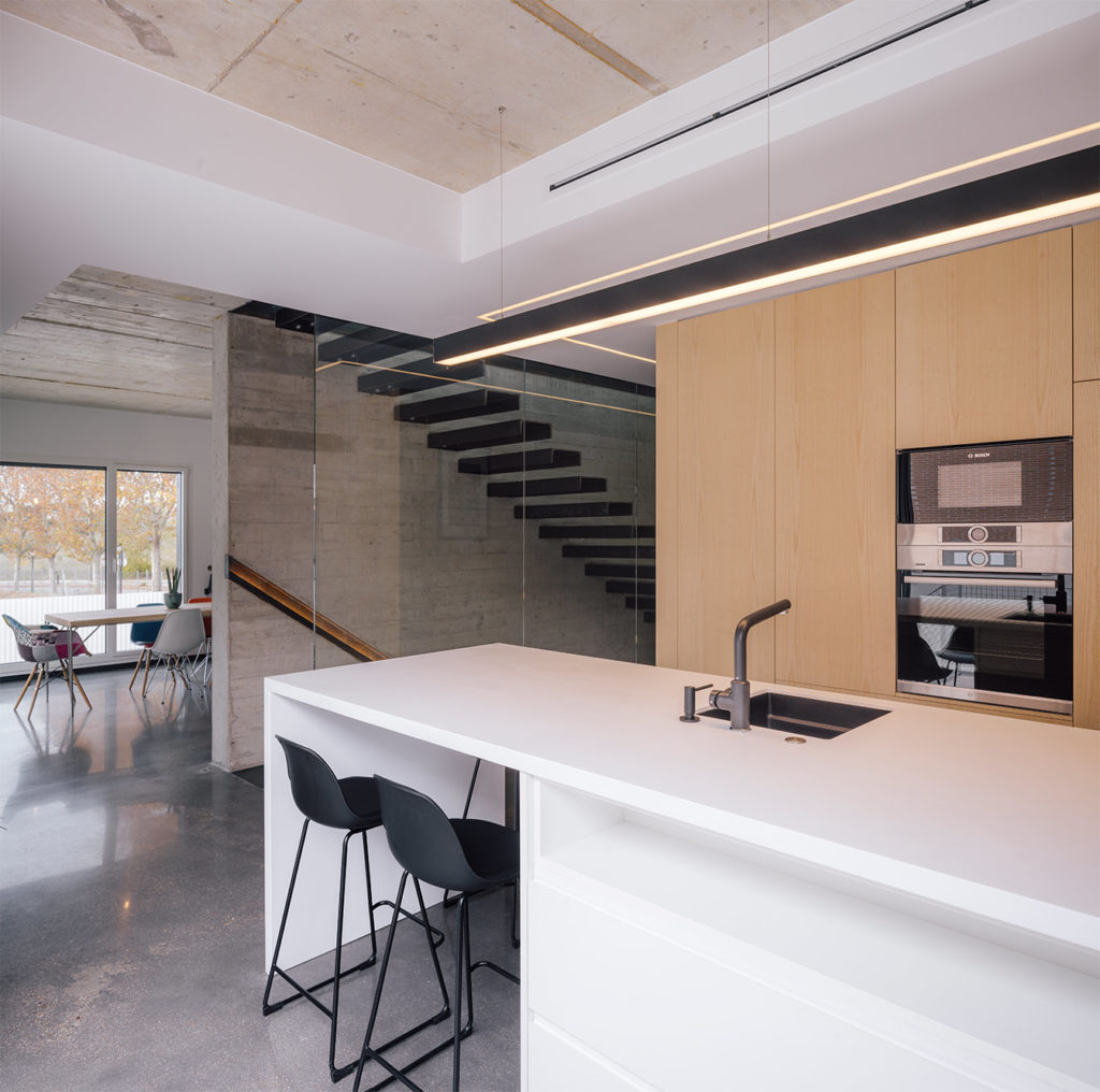 The house consists of three floors and a garden. First we find the access floor, which is diaphanous around a vertical communication core, compartmentalizing the interior which is easily adaptable to future uses of the house. Going up the stairway of steel steps cantilevered and embedded in the concrete wall creating a unique staircase, we access the upper floor. Also on this floor, which has been left free height to the roof, we can find the rooms of rest of the residents. Finally coming down all the stairs we reach the basement, where we find the garage and a multipurpose room with a window overlooking the outdoor pool.