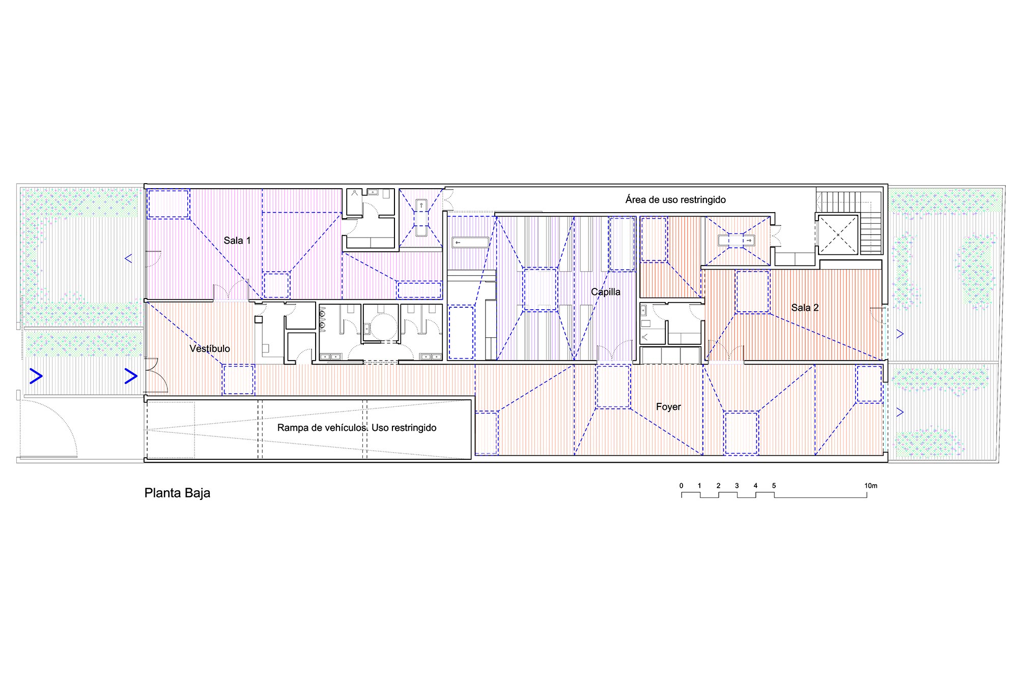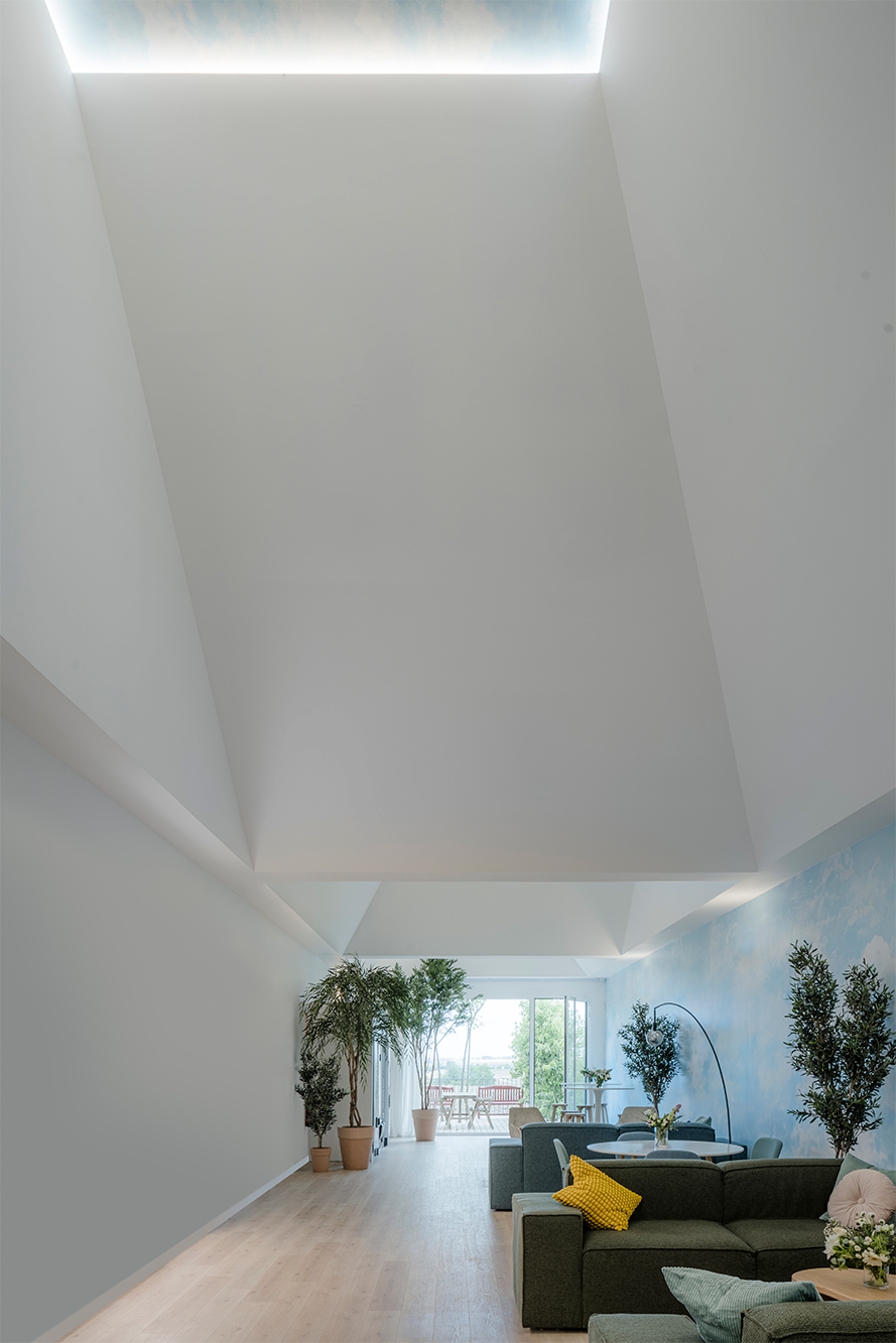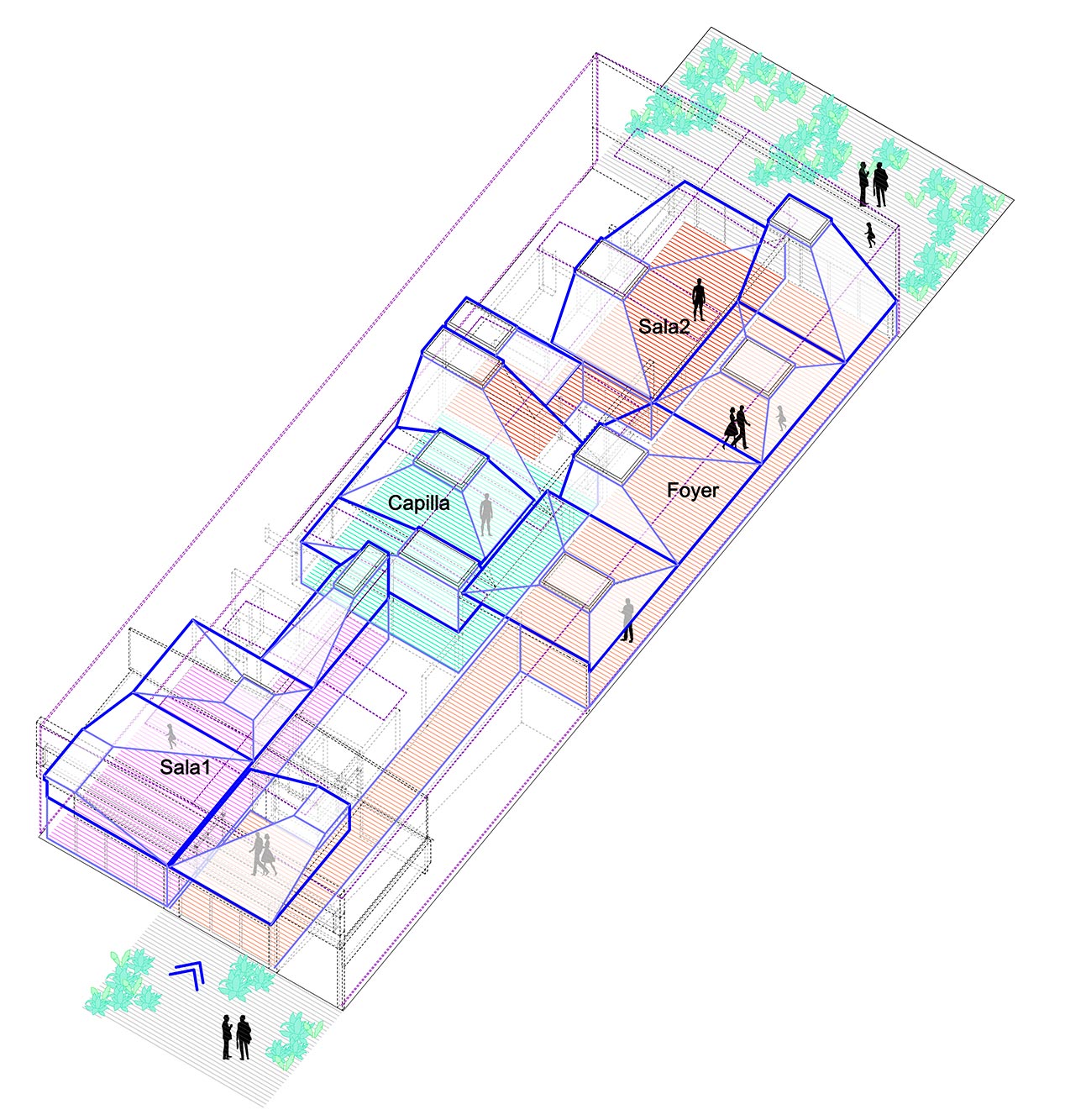La propuesta se concibe como la interposición de un conjunto de elementos ligeros de transición que, mediante el efecto de la compresión, juega con los espacios para producir efectos atmosféricos y fenomenológicos. Estas nuevas formas arrancan desde un gran zócalo horizontal de tres metros de altura y se proyectan hacia la cubierta en distintas direcciones, adquiriendo una geometría piramidal en cuya cúspide se introduce la luz. Con ello, se genera una nueva topografía suspendida que se adhiere sin producir efectos entre los sustratos preexistentes: la cubierta y el suelo.