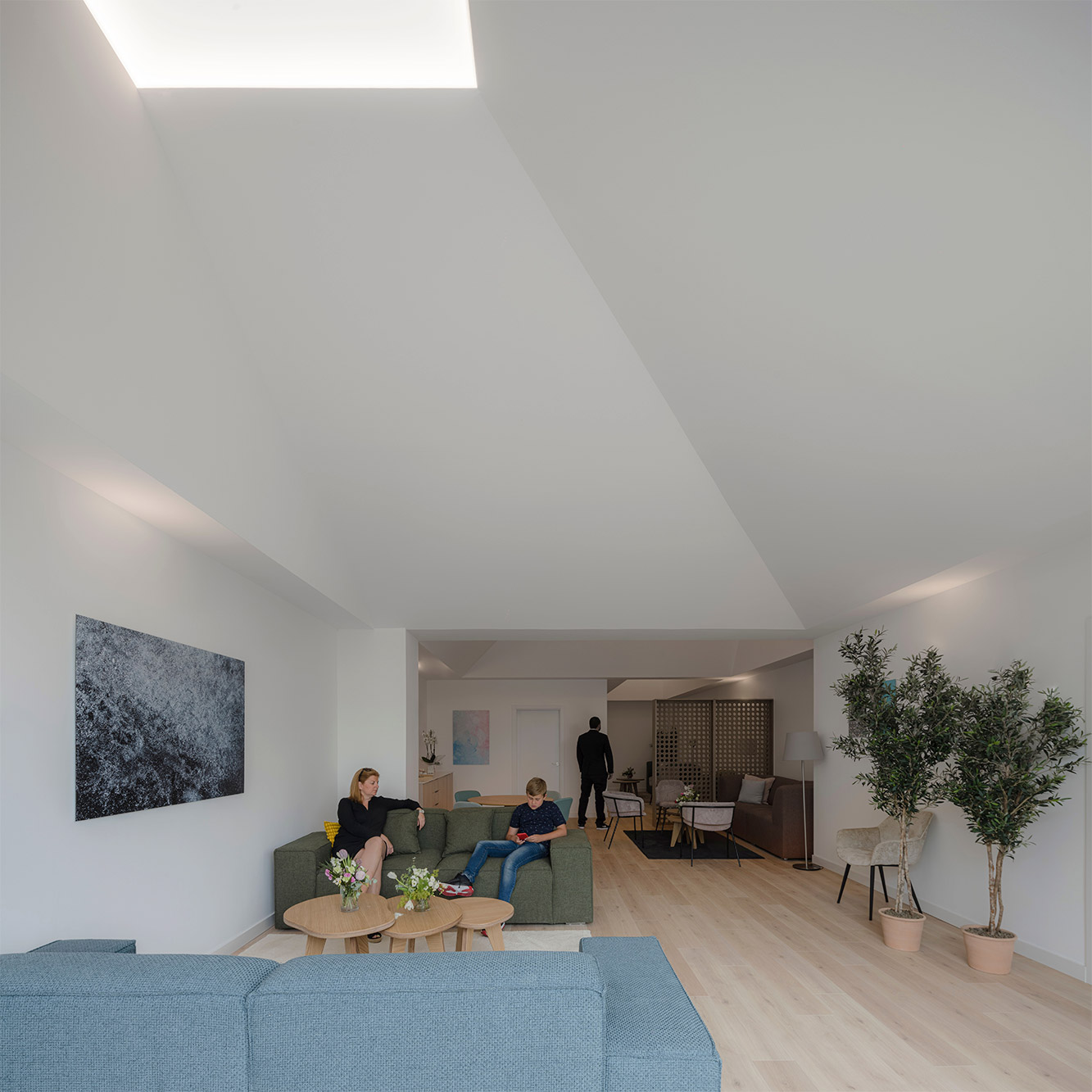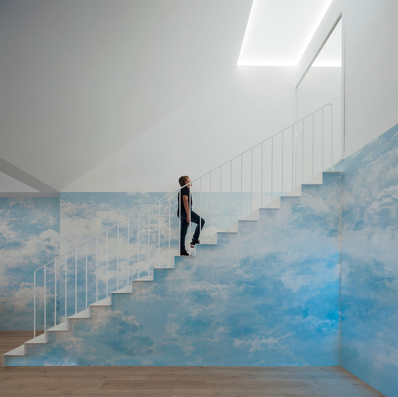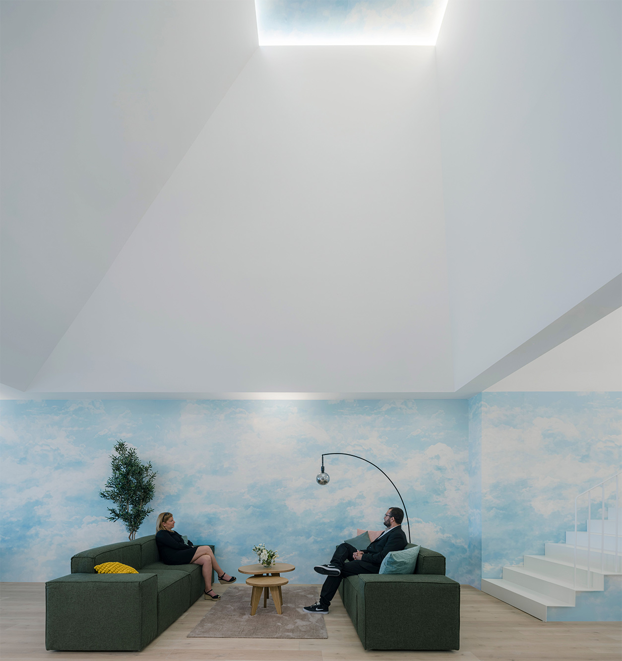 La propuesta se concibe como la interposición de un conjunto de elementos ligeros de transición que, mediante el efecto de la compresión, juega con los espacios para producir efectos atmosféricos y fenomenológicos. Estas nuevas formas arrancan desde un gran zócalo horizontal de tres metros de altura y se proyectan hacia la cubierta en distintas direcciones, adquiriendo una geometría piramidal en cuya cúspide se introduce la luz. Con ello, se genera una nueva topografía suspendida que se adhiere sin producir efectos entre los sustratos preexistentes: la cubierta y el suelo.