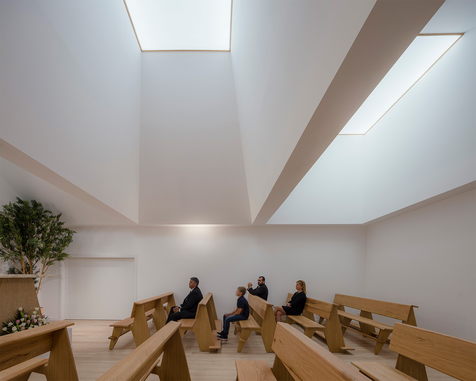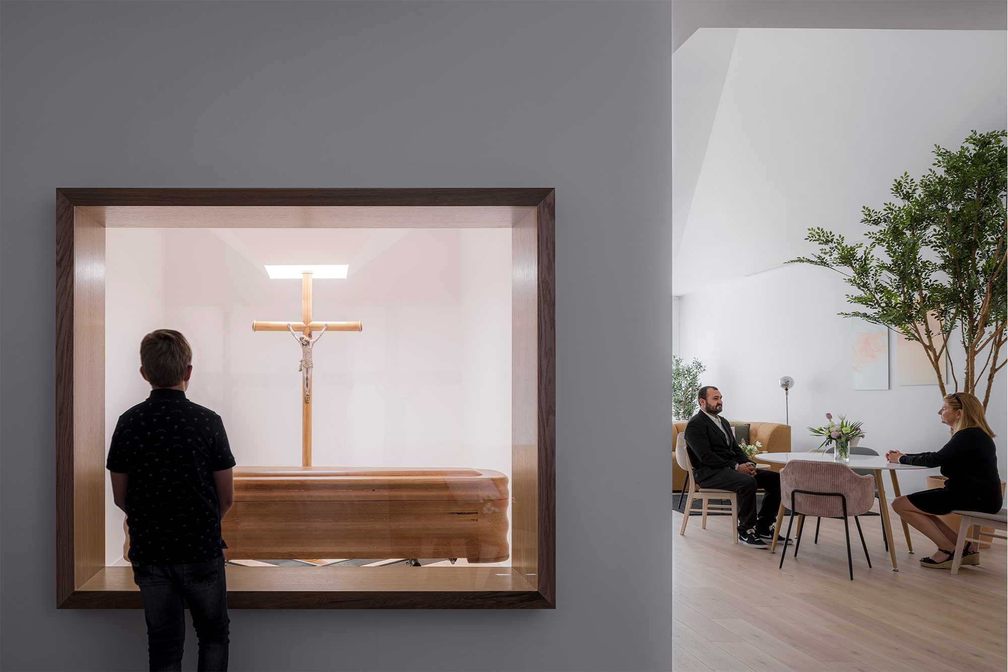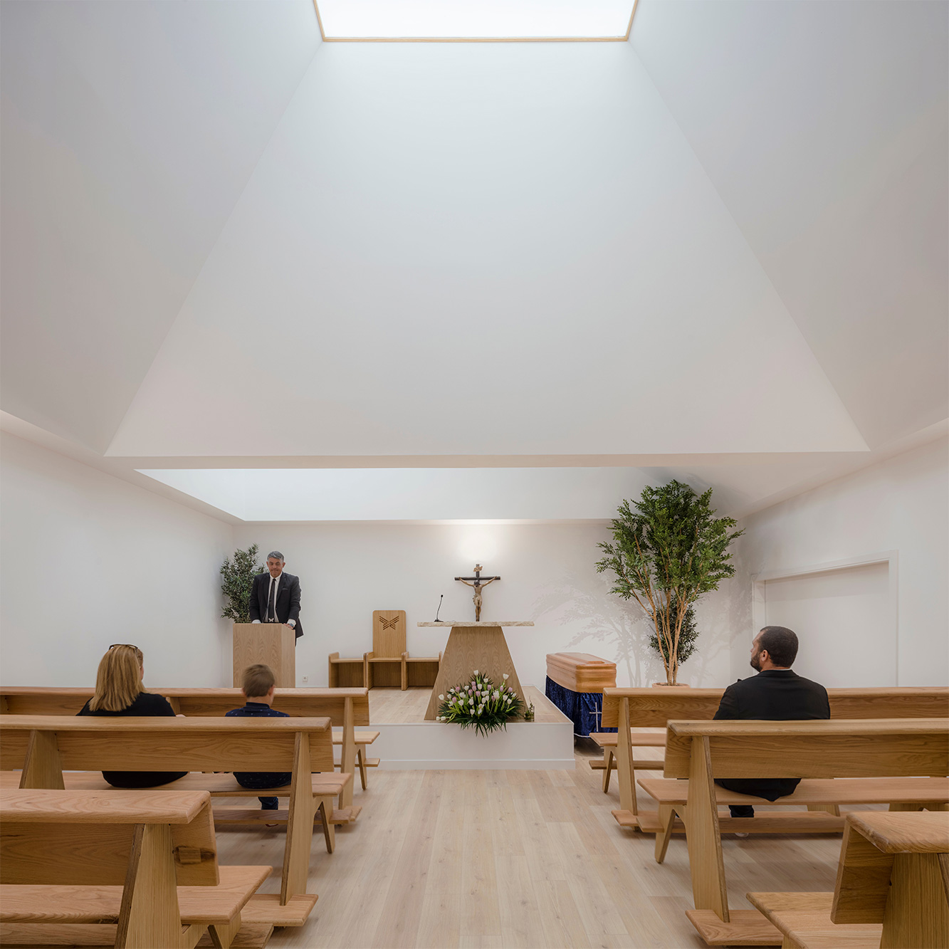 Cada una de las salas de velatorio se estructura a través de dos espacios diferenciados aunque convergentes. Por un lado, una gran zona de encuentro, cubierta por dos grandes pirámides, recibe a los familiares y amigos del fallecido promoviendo la conversación. Desde esta, y de una forma tangencial, se accede al espacio más íntimo del tanatorio que se ilumina por una pirámide de menor tamaño y en el que el visitante puede despedir y observar el féretro, quedando este oculto a la primera mirada del observar cuando accede a la sala. En este caso, la pirámide del túmulo donde descansa el fallecido se invierte y se descuelga en su punto central para producir un ligero contacto, al modo de Noli me Tangere, que busca la evocación de su tránsito.