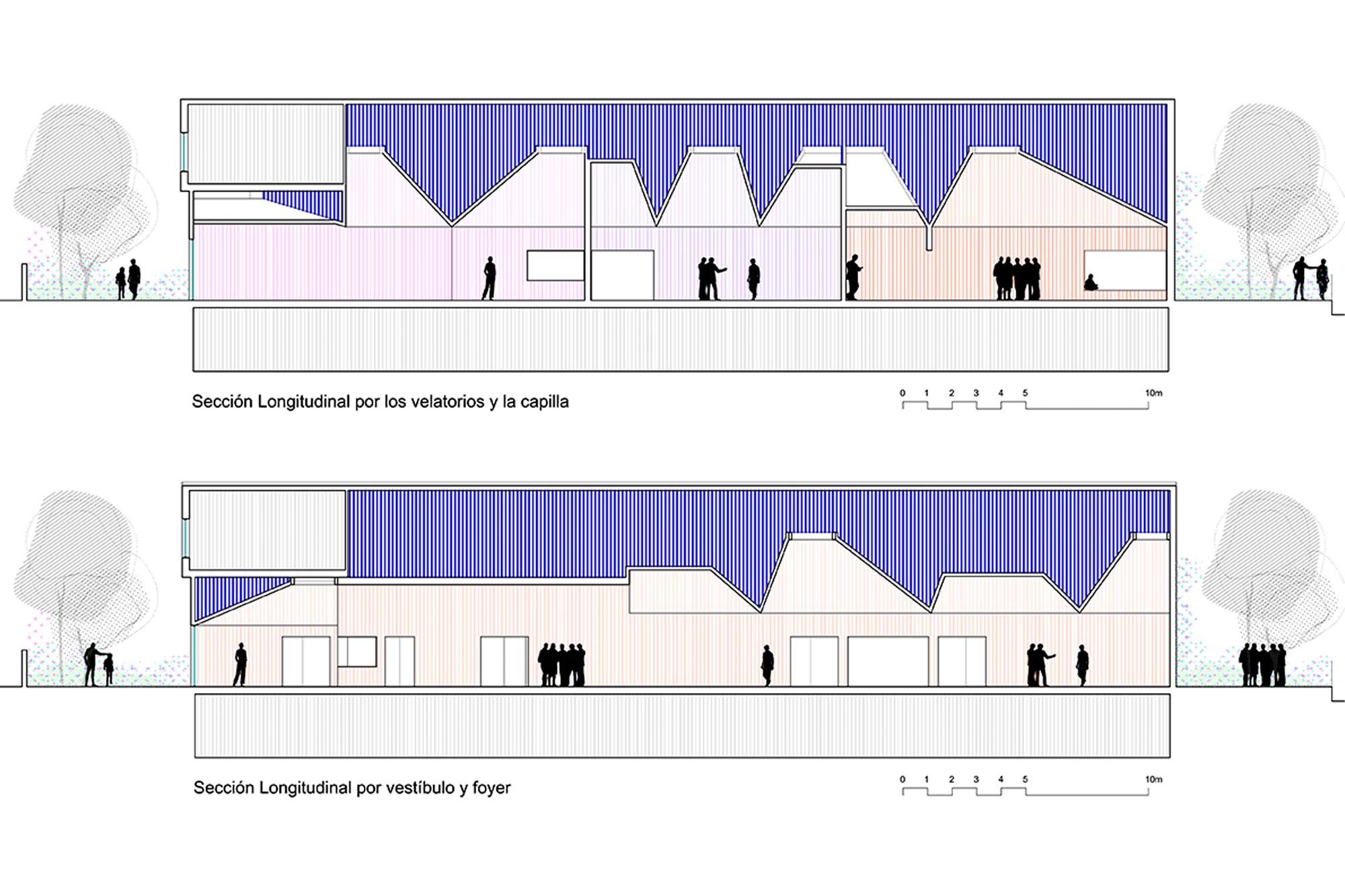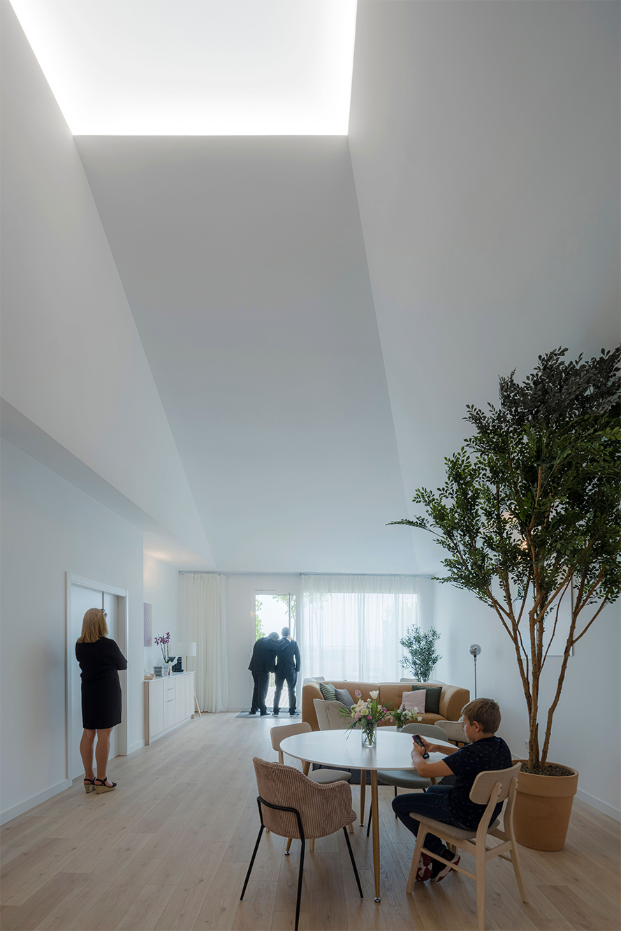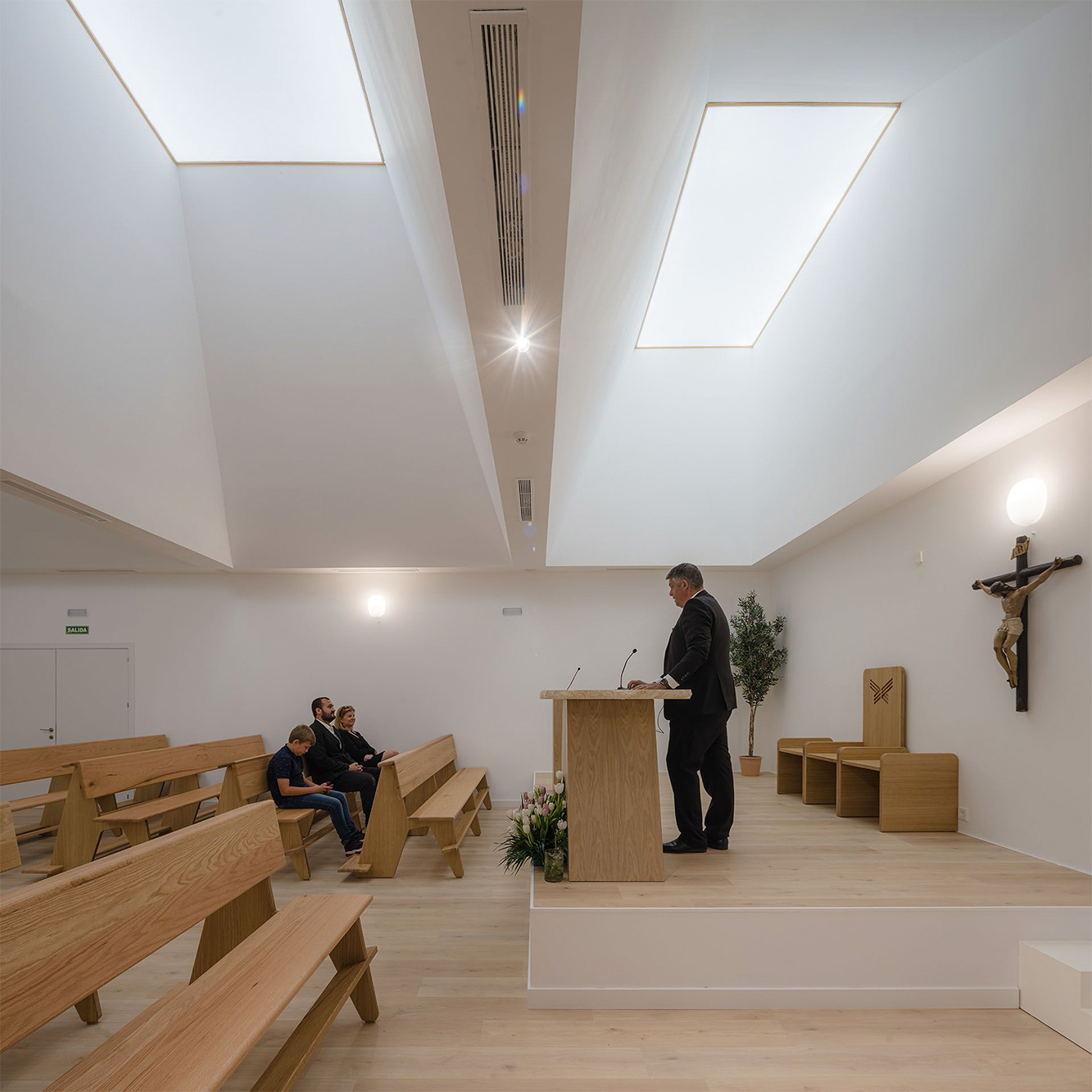 Cada una de las salas de velatorio se estructura a través de dos espacios diferenciados aunque convergentes. Por un lado, una gran zona de encuentro, cubierta por dos grandes pirámides, recibe a los familiares y amigos del fallecido promoviendo la conversación. Desde esta, y de una forma tangencial, se accede al espacio más íntimo del tanatorio que se ilumina por una pirámide de menor tamaño y en el que el visitante puede despedir y observar el féretro, quedando este oculto a la primera mirada del observar cuando accede a la sala. En este caso, la pirámide del túmulo donde descansa el fallecido se invierte y se descuelga en su punto central para producir un ligero contacto, al modo de Noli me Tangere, que busca la evocación de su tránsito.